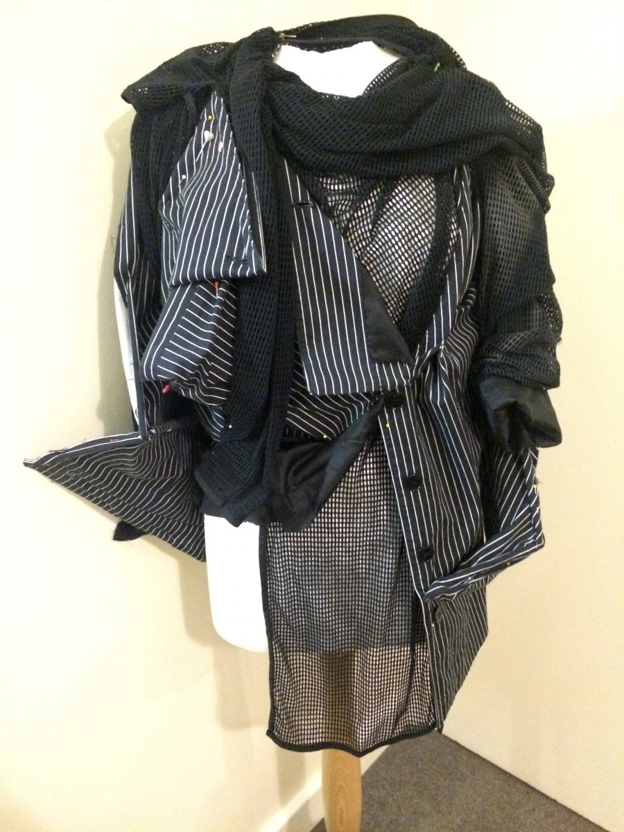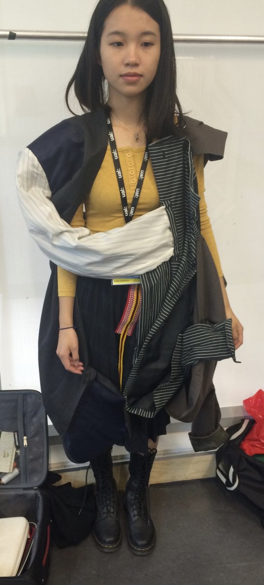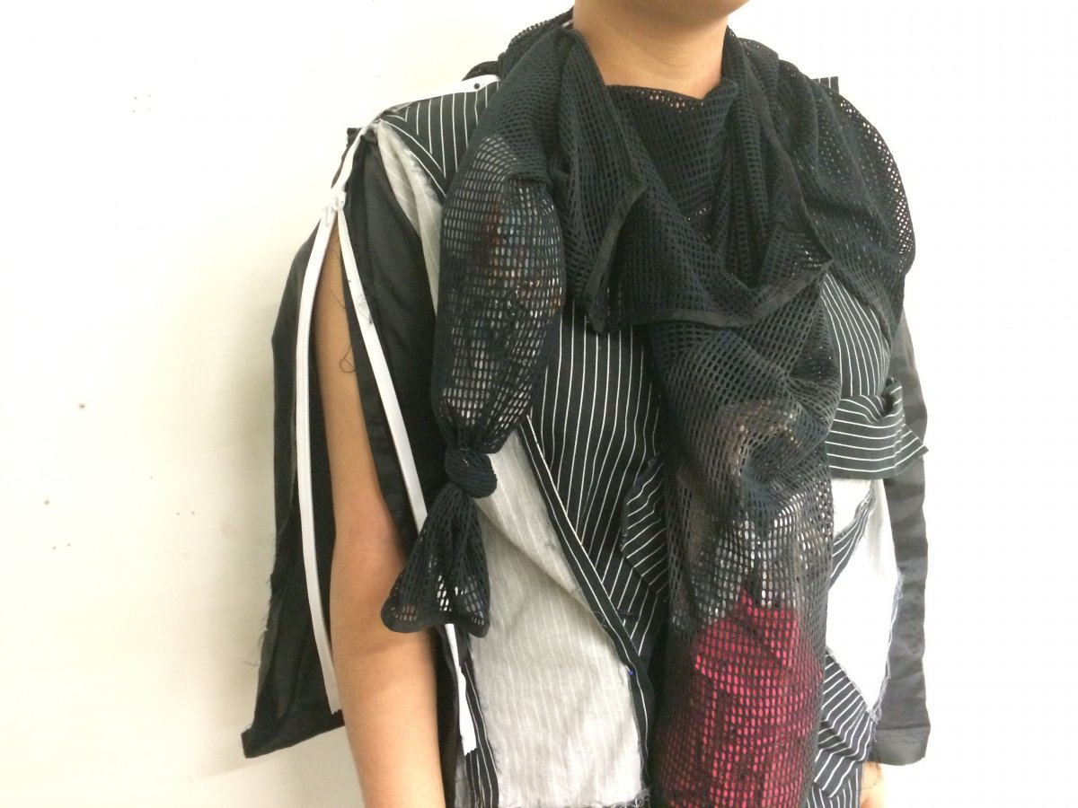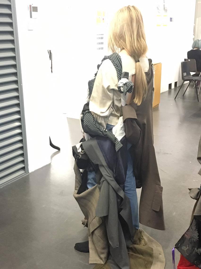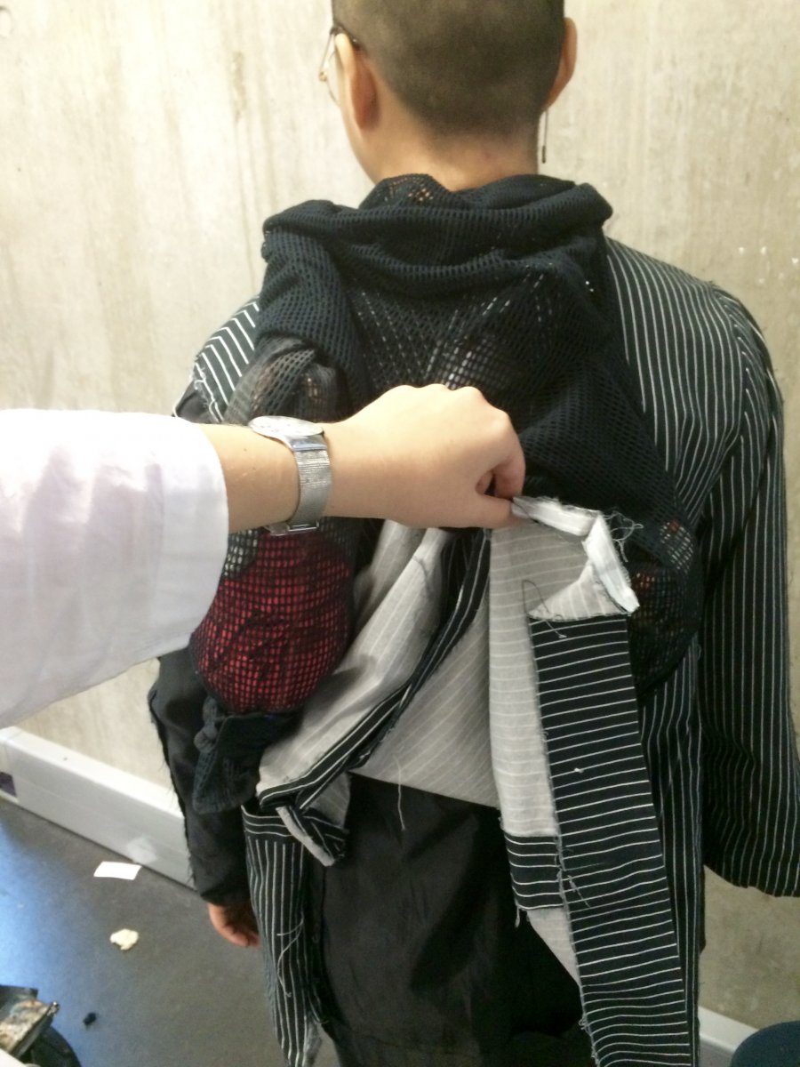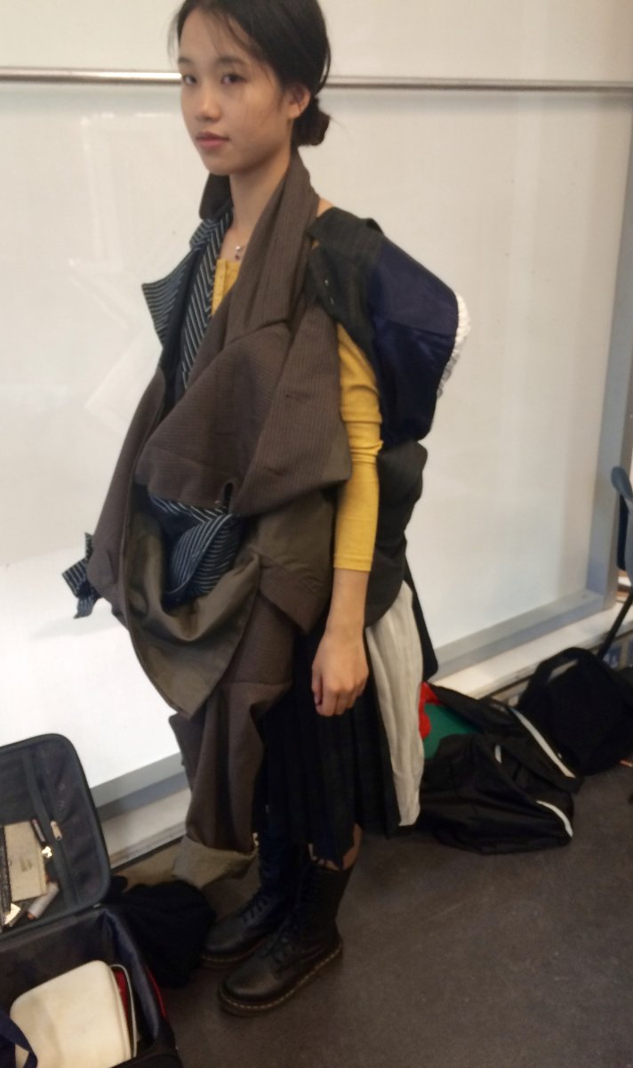 Idea: jacket becomes multifunctional when attached handbag and a big ' pocket ' on the back of garment replace usual idea of backpack