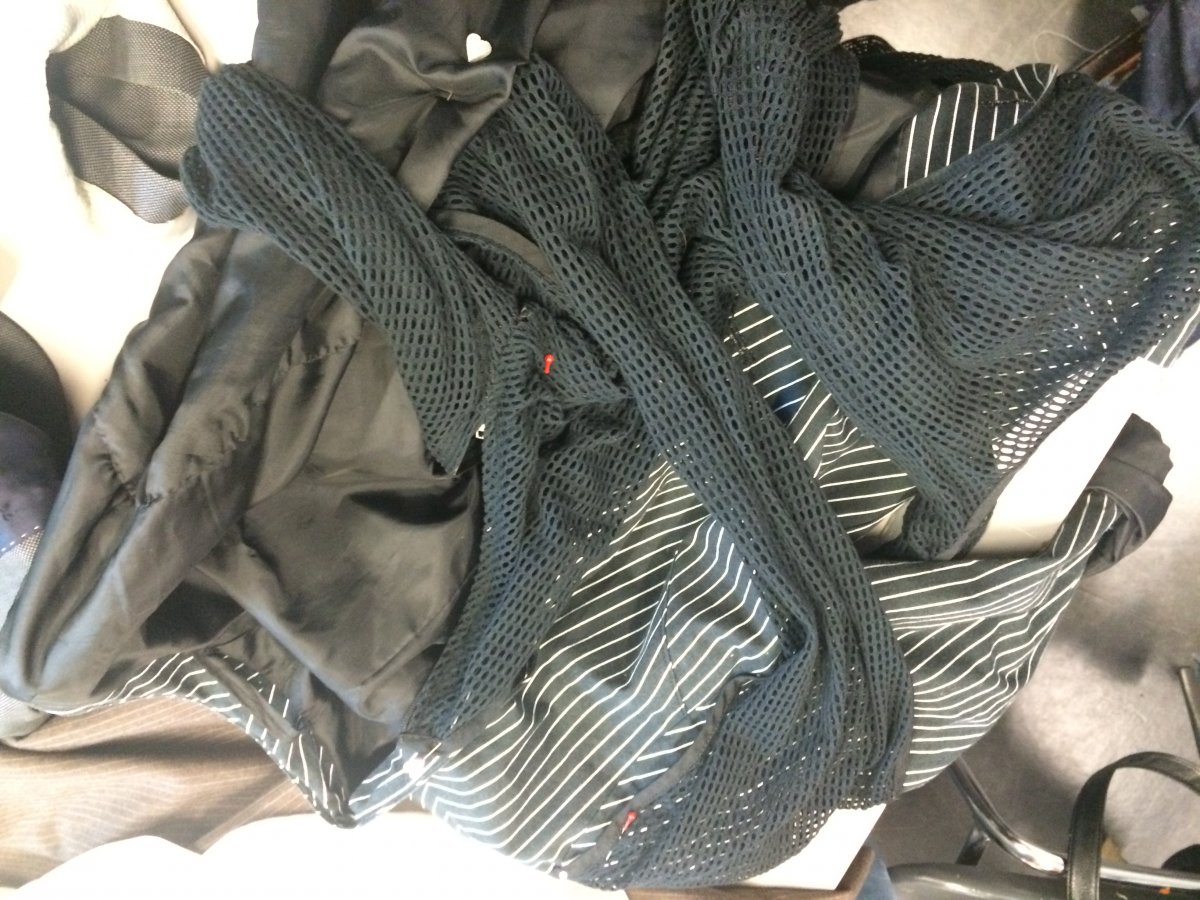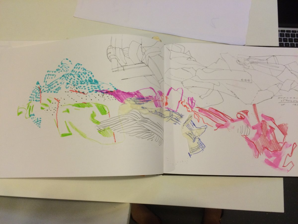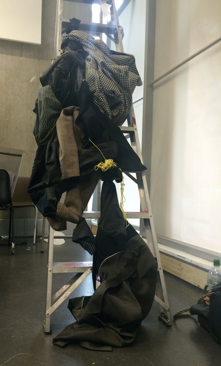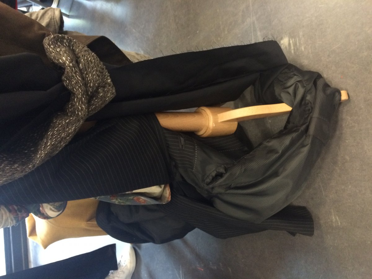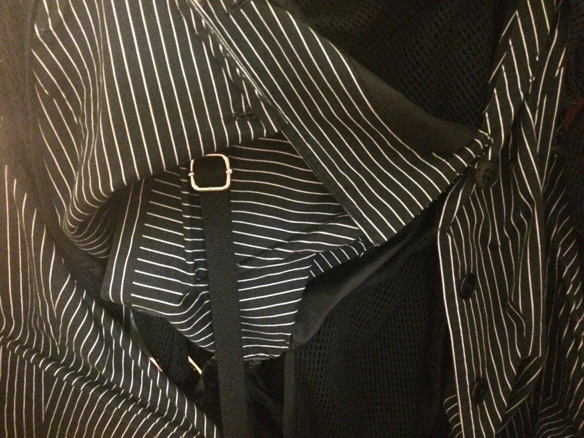 Idea: jacket becomes multifunctional when attached handbag and a big ' pocket ' on the back of garment replace usual idea of backpack